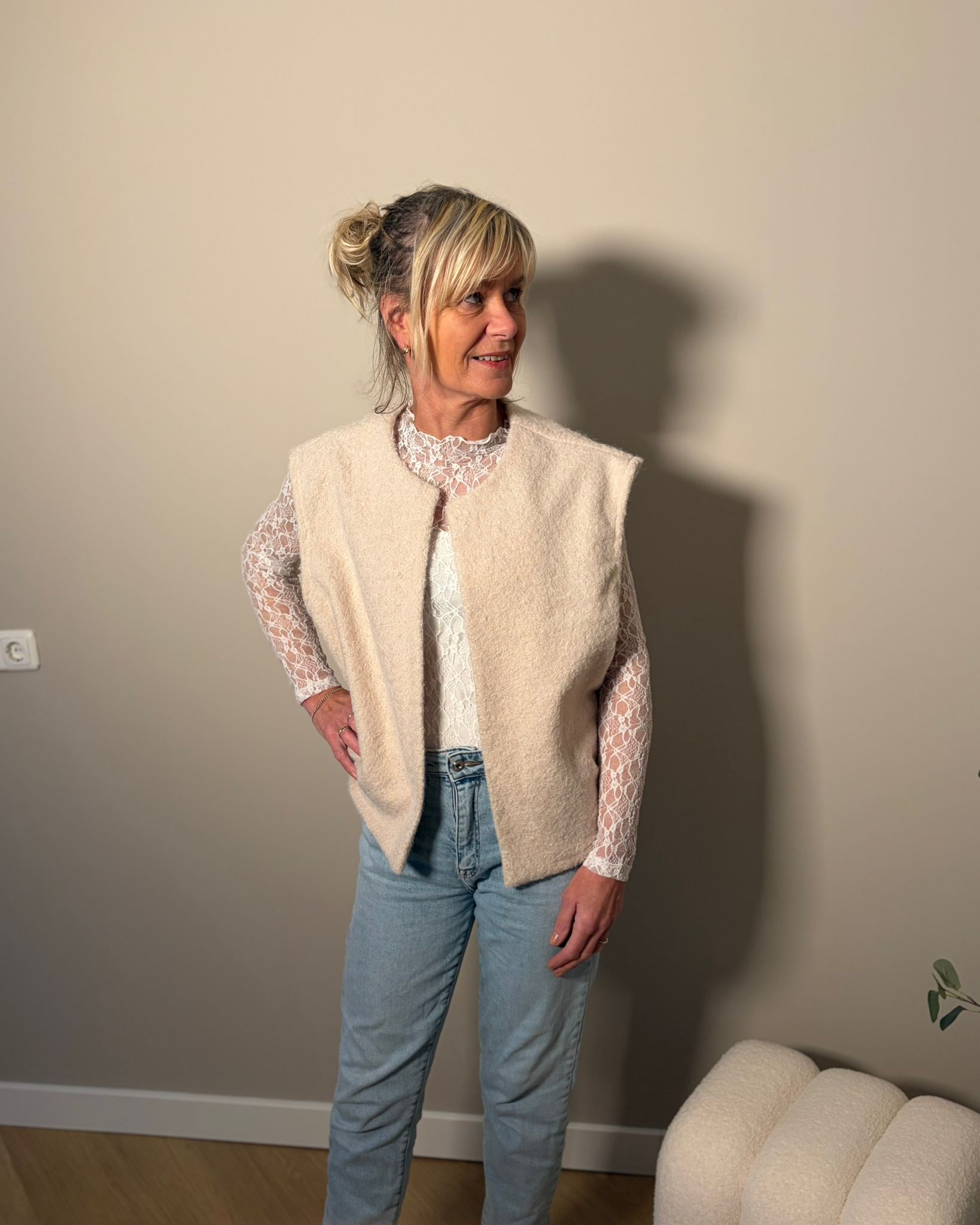 Het gilet is met haar one size van maat S (los) tot en met maat XL te dragen.  Het gilet heeft een harig effect op de stof,  aan de zijkanten heeft het gilet steekzakken. Een echte musthave!