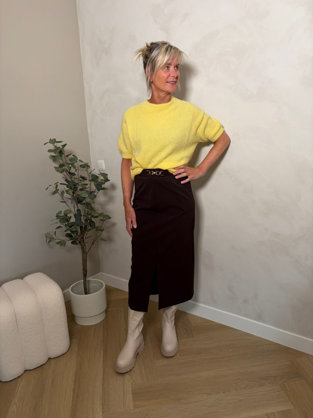 Het jurkje is 95 centimeter lang. Anja draagt maat S/Met , ze is 170 centimeter lang.