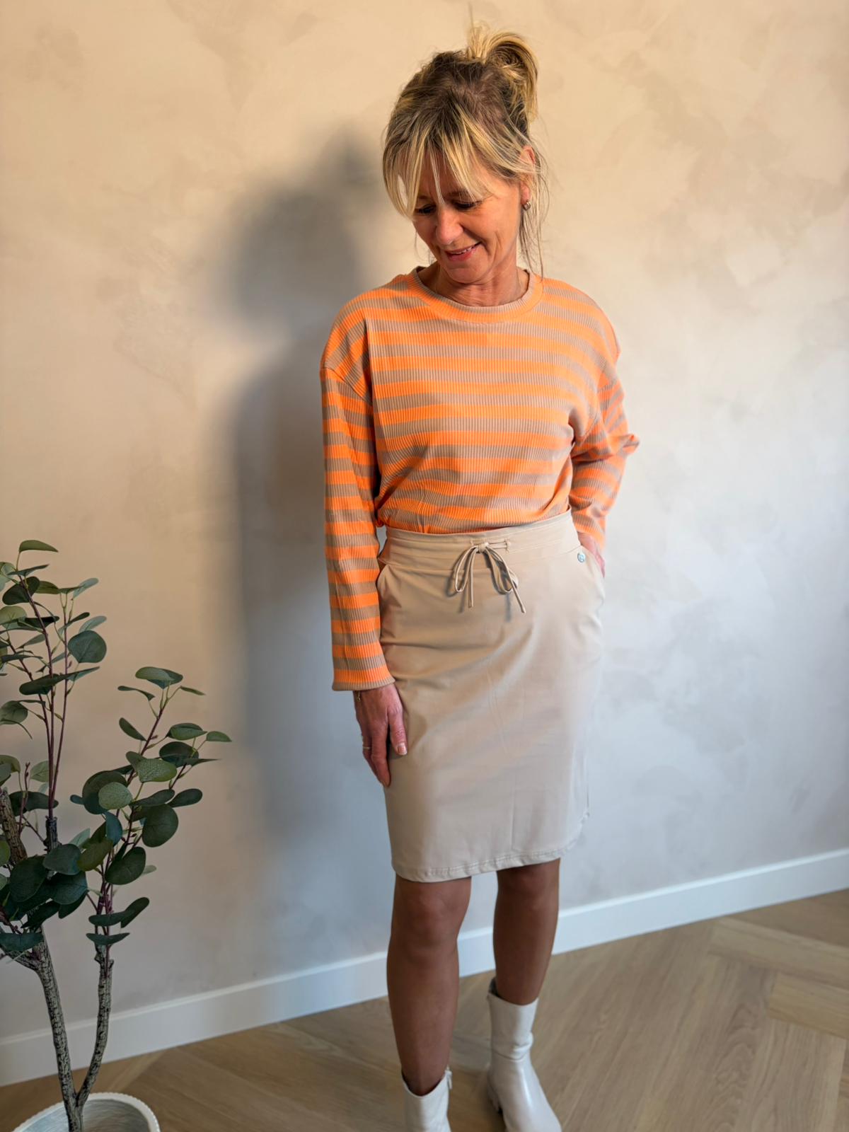 Een beige/oranje streep top met een speelse en vrolijke uitstraling. Het gestreepte patroon geeft de top een trendy en eigentijdse look. Perfect te combineren voor een casual en zonnige outfit.