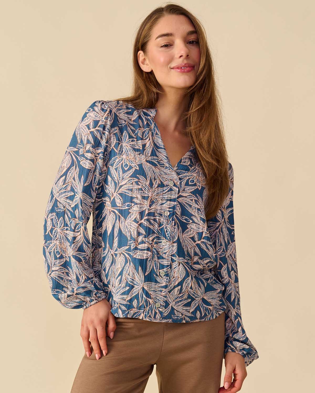 De blouse Fia in jeans met bloemen dessin heeft een losvallende pasvorm en een speelse en elegante uitstraling. Een luchtige viscose krinkel kwaliteit. De V-hals, sierknopen en elastische manchetten zorgen voor een vrouwelijke uitstraling.