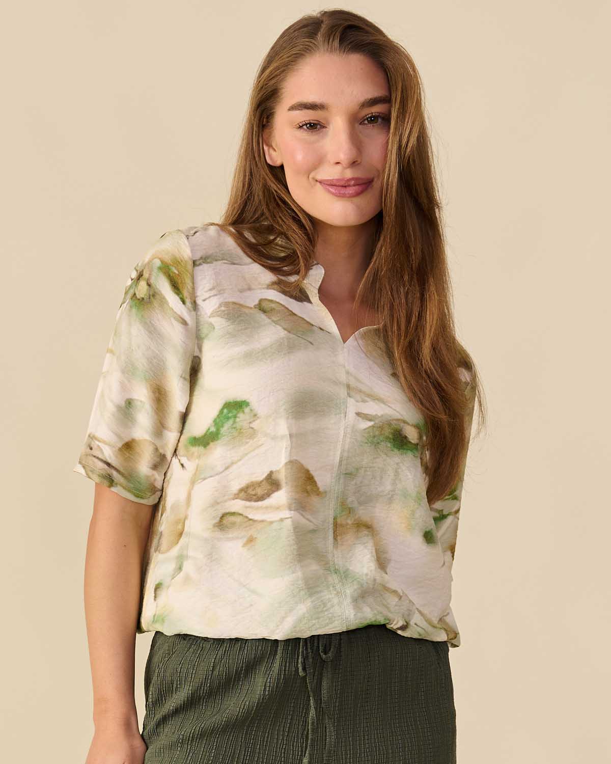 De blouson Doortje in jeans met bloemen dessin heeft een rechtvallende pasvorm en een tijdloze uitstraling. De V-hals, half opstaande kraag en het elastiek aan de onderkant zorgen voor een blousend effect.
