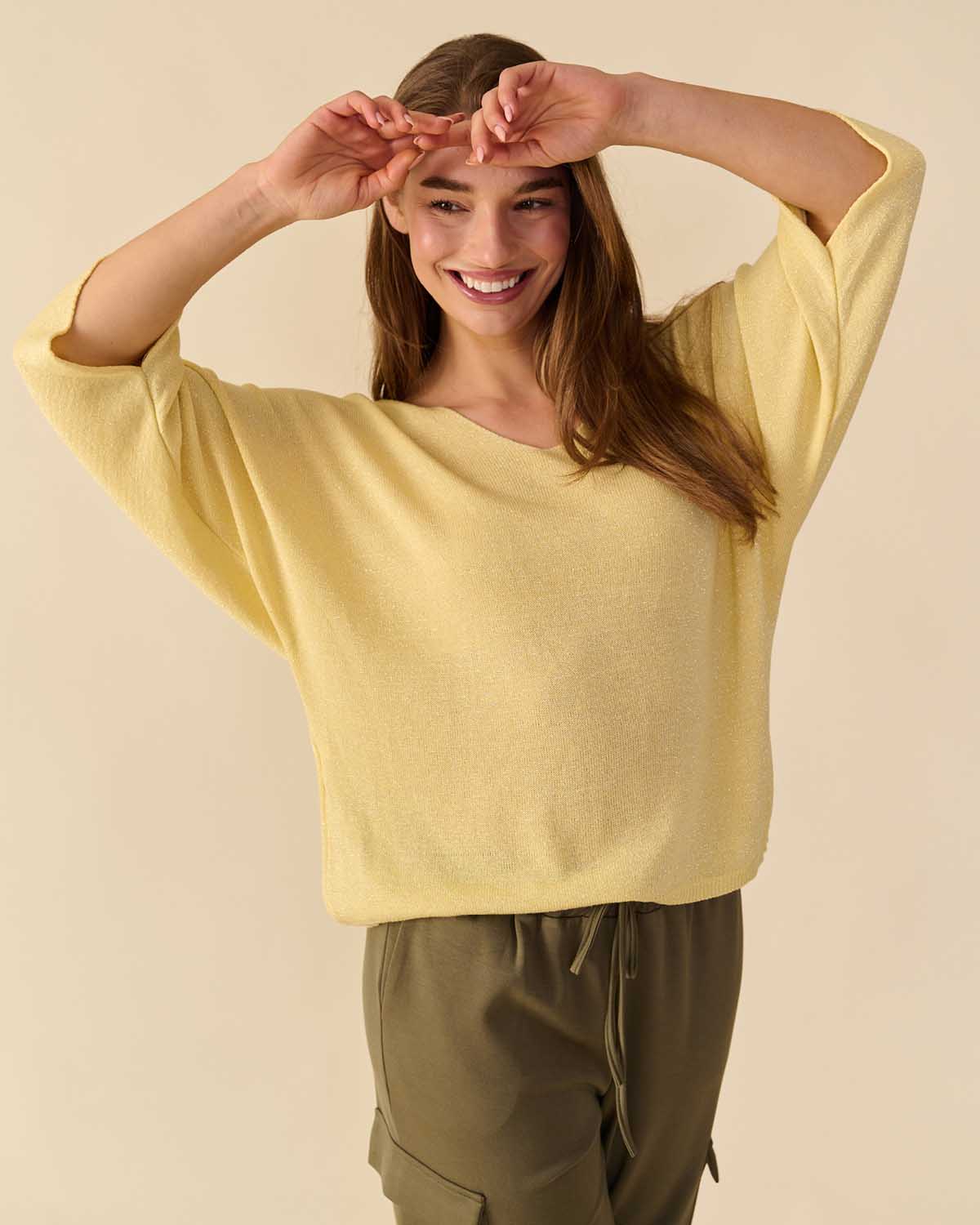 De trui Lieve in reseda summer knit met lurex detail heeft een losvallende pasvorm en een relaxed en tijdloze uitstraling. Met korte mouwen en een v-hals . De V-hals en relaxte fit maken dit model heerlijk om te dragen, ook op warmere dagen. Fijn voor naar je werk, een dagje weg of gewoon thuis.