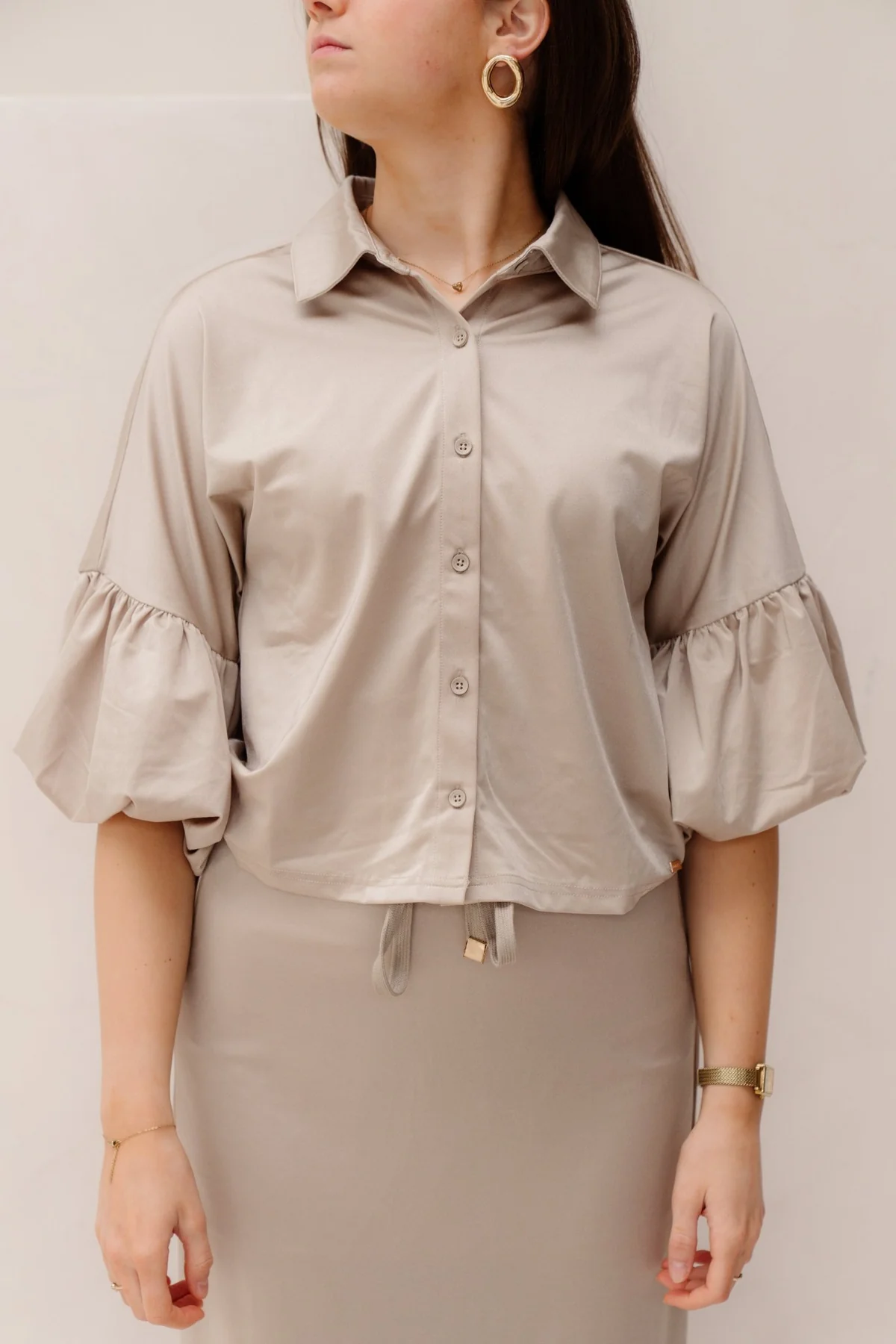 De Senna Blouse is een elegante, vrouwelijke blouse met een luxueuze glans en een moderne, speelse uitstraling. Het ontwerp valt op door de volumineuze 3/4‑poefmouwen met sierlijke rimpeling, combineer deze blouse o.a bij de Nina skirt voor een stijlvolle combinatie.