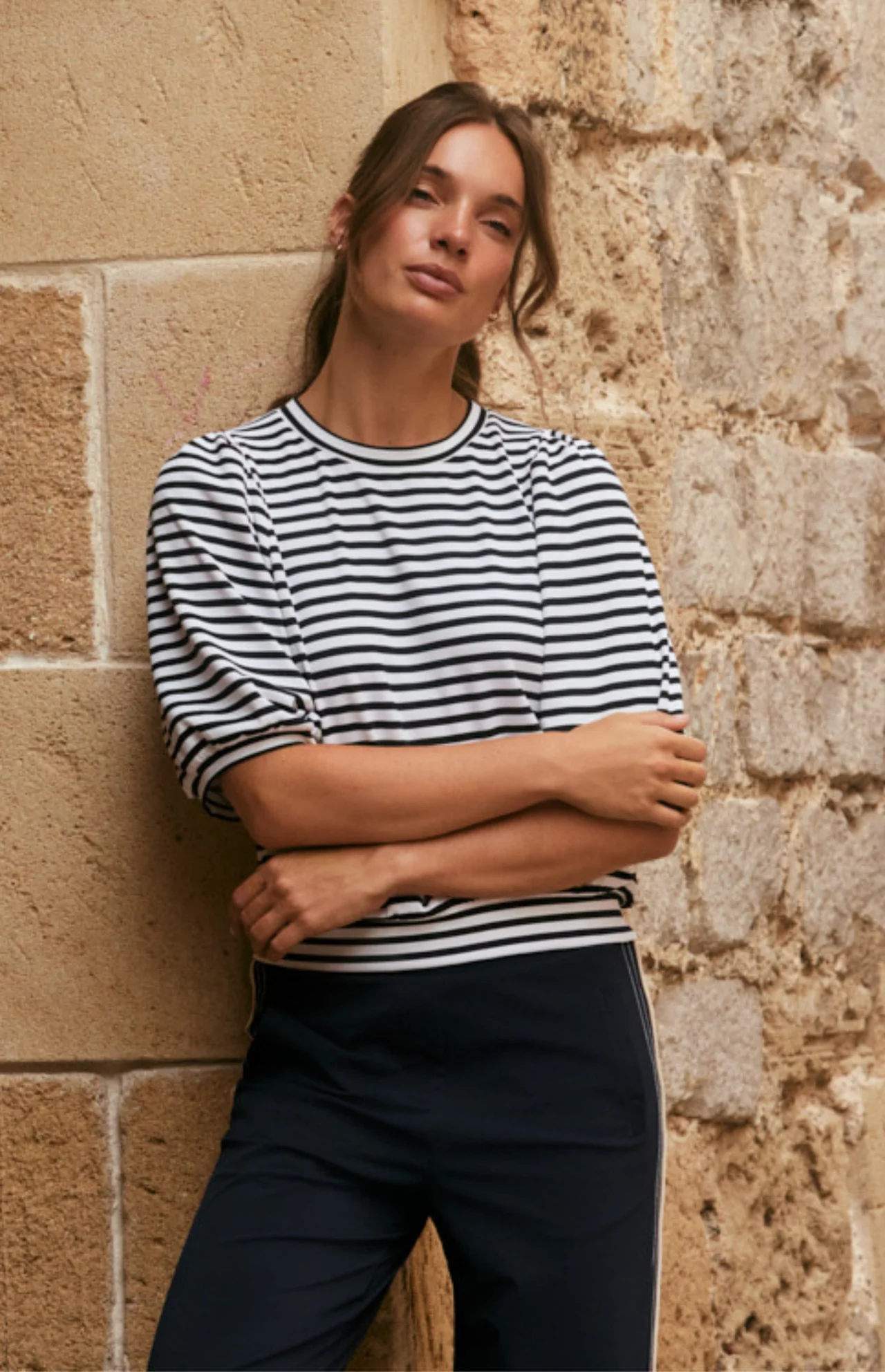 Deze mooie ronde hals top van Lady Day heeft korte licht gepofte mouwen, wat heerlijk luchtig draagt en stijlvol staat. Deze top valt goed op maat.