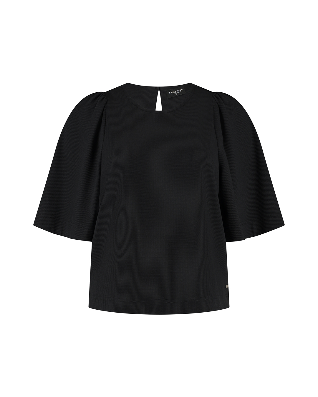 Deze mooie ronde hals top van Lady Day heeft korte uitlopende mouwen, wat heerlijk luchtig draagt en de trend van dit seizoen is. Deze top valt goed op maat.