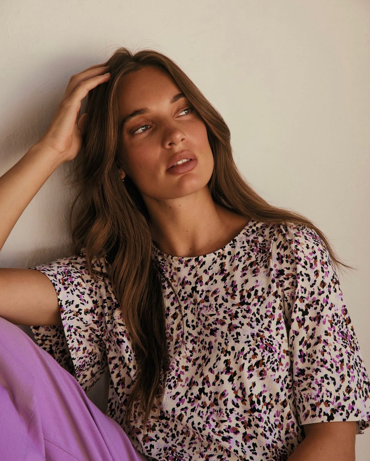 Deze mooie ronde hals top van Lady Day heeft korte uitlopende mouwen, wat heerlijk luchtig draagt en de trend van dit seizoen is. Deze top valt goed op maat.