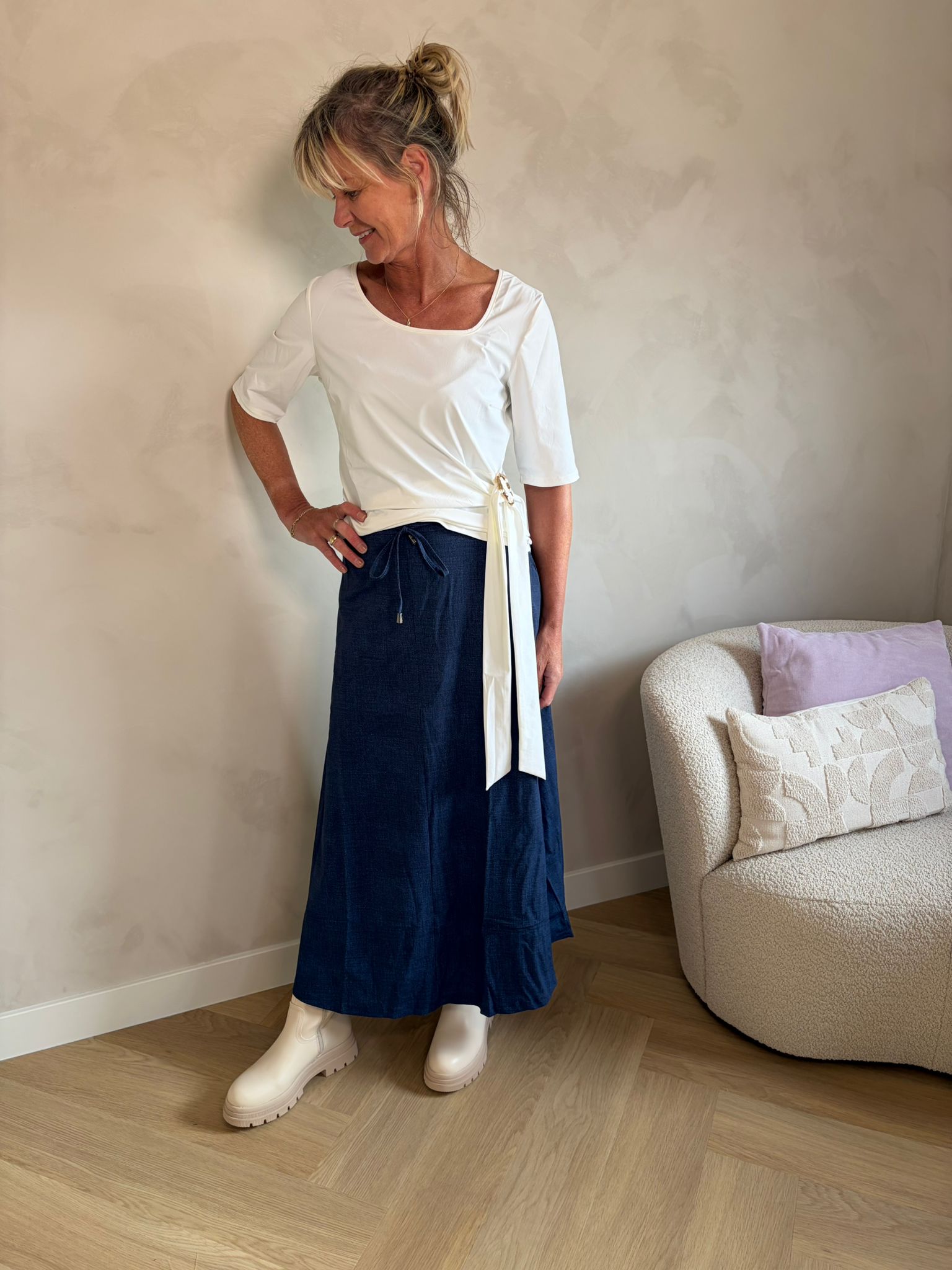 De 202123 rok van Mi Piace is vervaardigd uit kwaliteitsvolle travelstof. De lange rok is voorzien van een elastische tailleband met aanrijgkoordjes en heeft een A-lijn model.