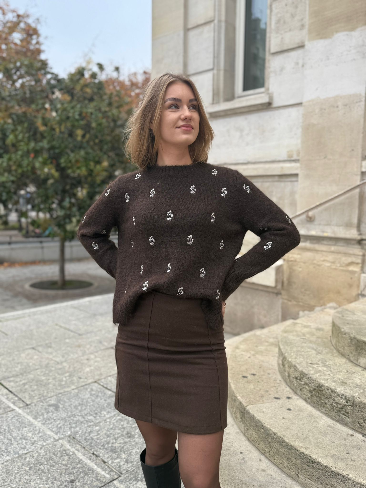 Deze zachte trui  is perfect te combineren met de donkerbruin trend. De trui is onesize en draagbaar van maat S tot en met L.