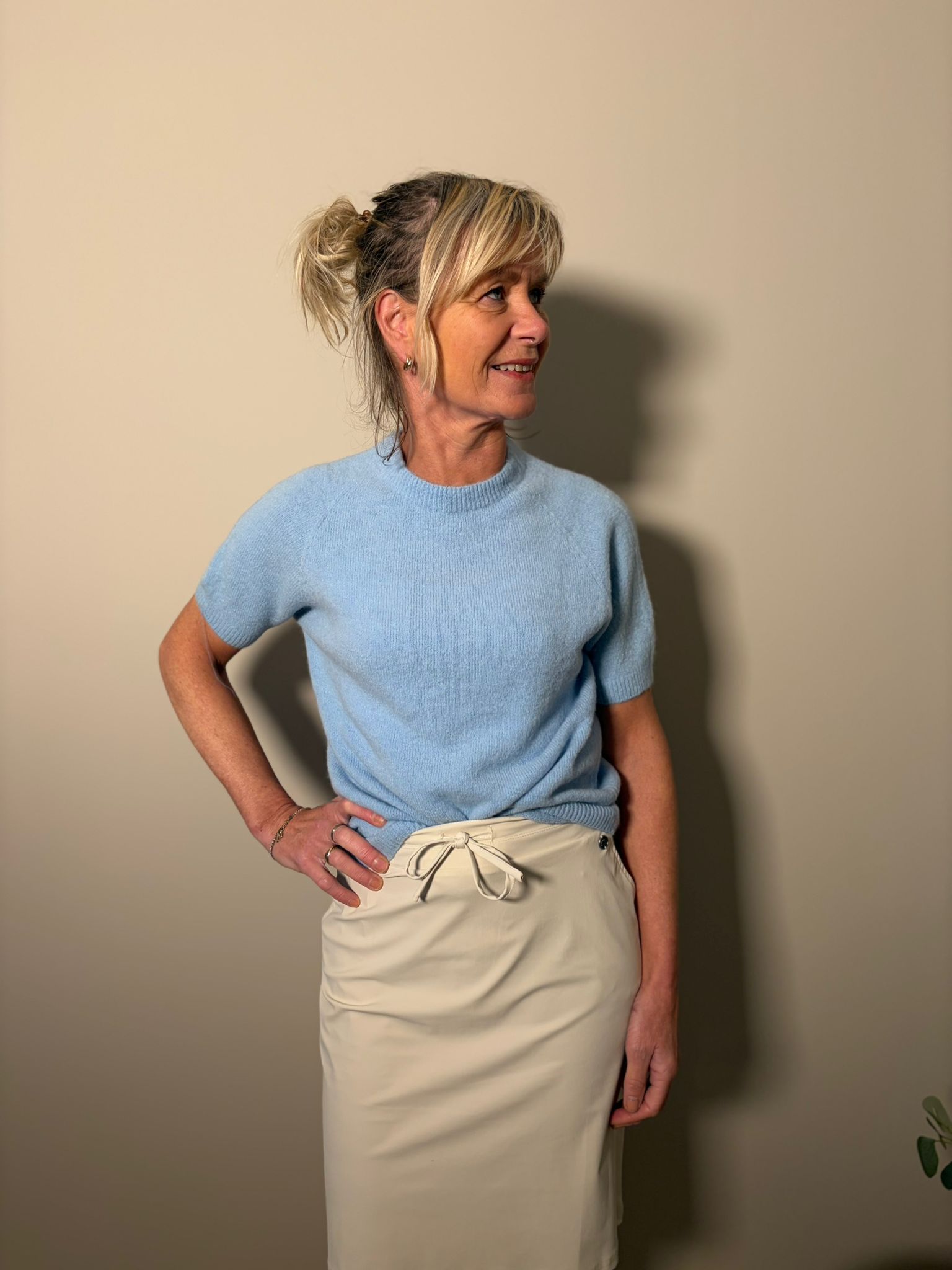 One size top met ronde hals en korte mouw. Deze trui is van zeer zacht baby alpaca wol. De trui is one size en past van maat 36 tot 44.