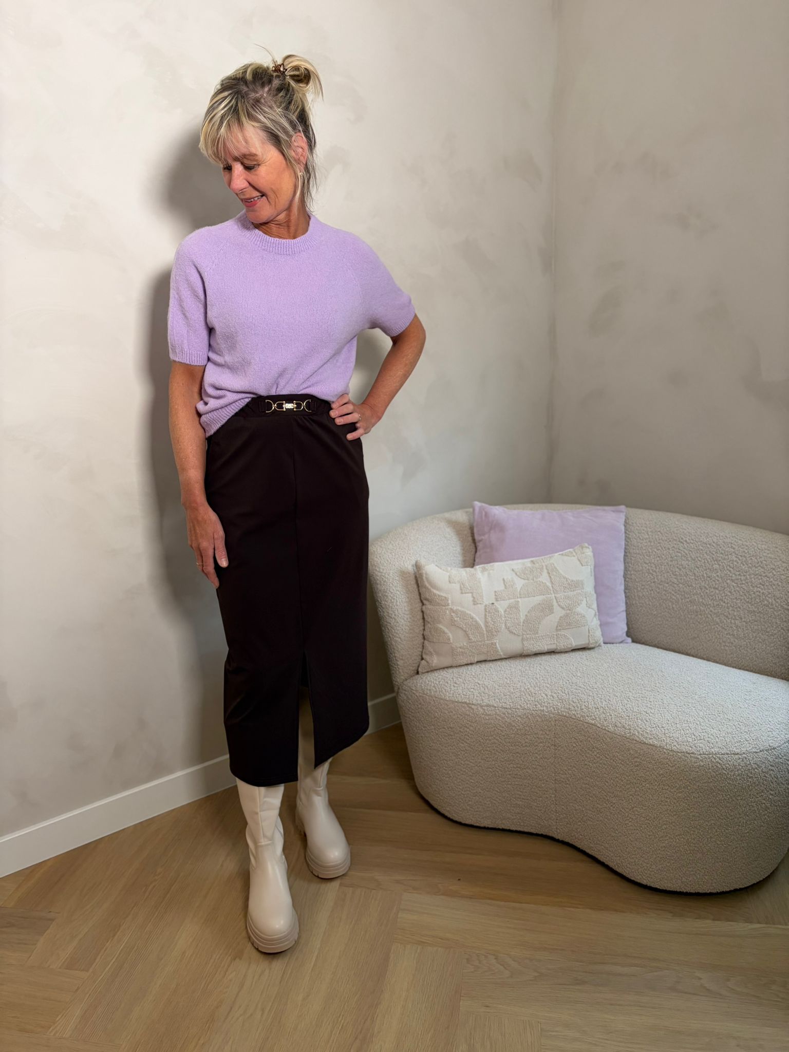 One size top met ronde hals en korte mouw. Deze trui is van zeer zacht baby alpaca wol. De trui is one size en past van maat 36 tot 44.