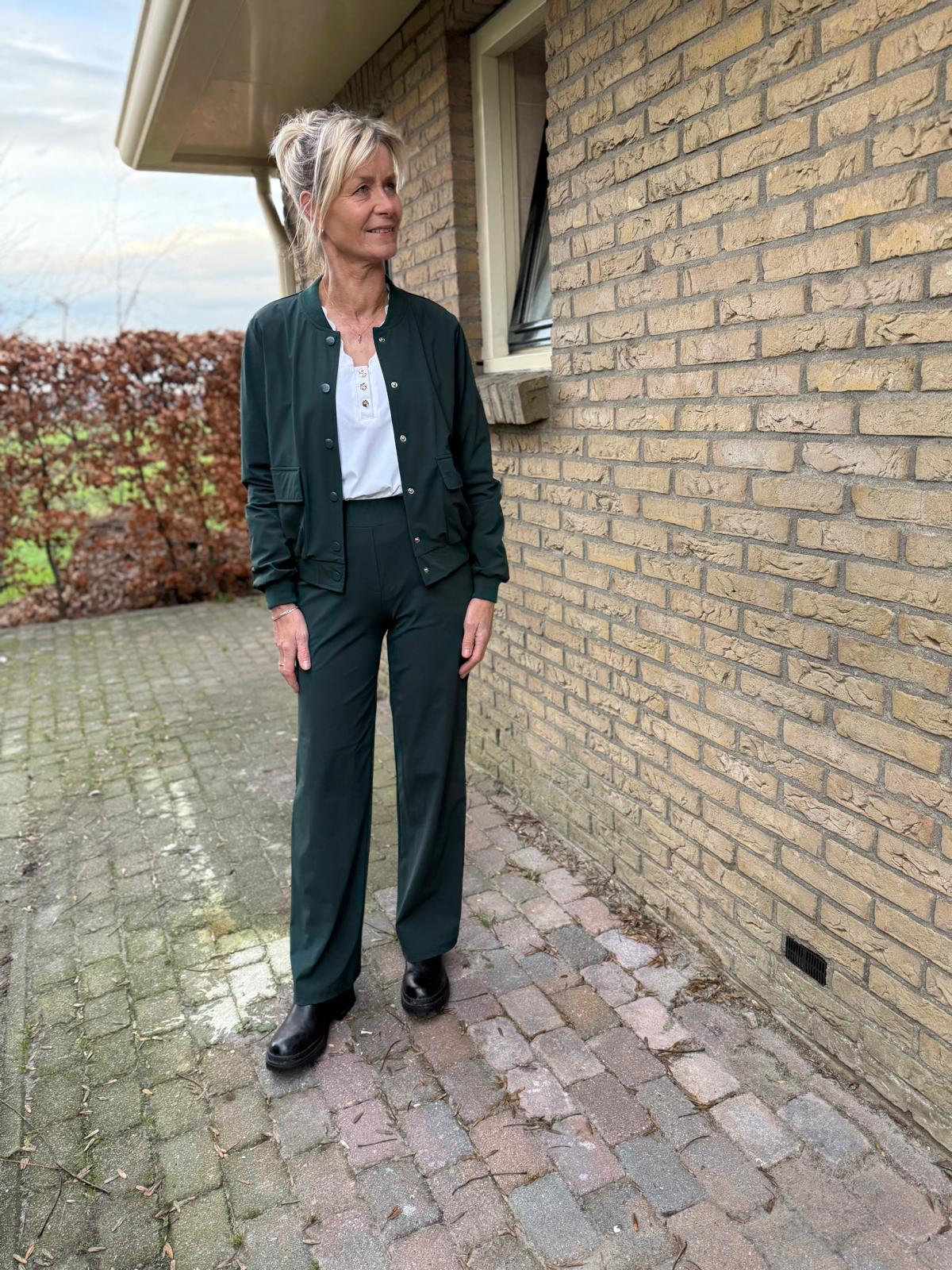 Deze wijde broek is zowel vrouwelijk als flatterend. De stevige travelstof voelt aan als een tweede huid en zorgt ervoor dat je figuur prachtig wordt geaccentueerd. De broek sluit perfect aan bij de heupen en billen, terwijl de pijpen wijd en recht zijn. Lengte broekspijpen: