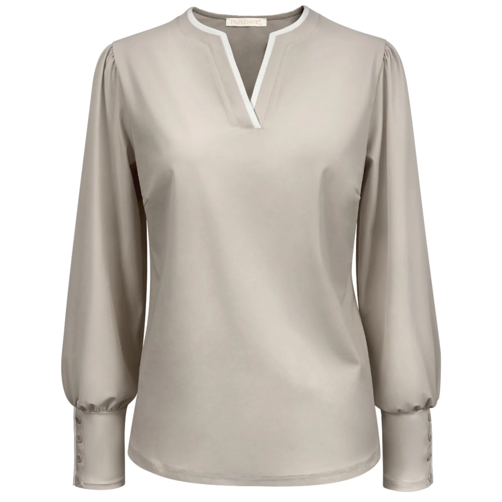 Een nieuw model in de collectie van Triple Nine. Een top met ronde hals met overgang in v waarlangs een witte bies loopt. De top heeft lange licht poffende mouwen met manchetten waar knopen opgestikt zijn en de wit gekleurde bies weer terug komt. Dit artikel van top kwaliteit travelstof is een aanvulling op je garderobe en geeft een elegante touch. De top valt goed op maat tot klein S = 36.