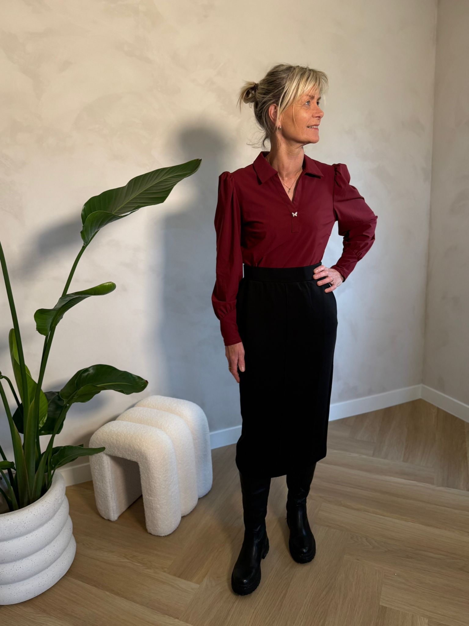 Een top met kraag en v-hals welke eindigt met een vlinder knoopje. De top heeft licht poffende mouwen met manchetten. blouse valt goed op maat S = 36.