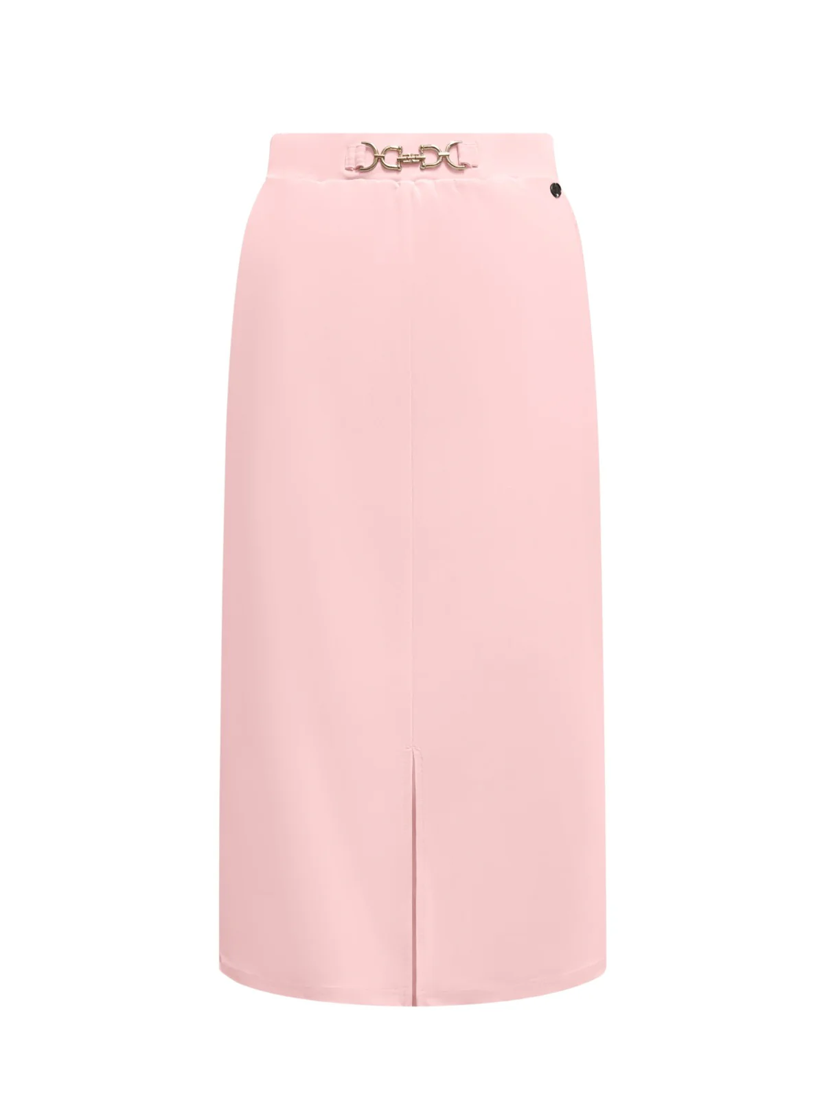 Vernieuwde versie van deze bestseller rok, door het gouden gespje aan de voorkant.  De rok heeft steekzakken en een brede band aan de bovenkant. De rok heeft een split aan de voorkant. Bij twijfel over de maat, adviseren we een maat groter. Lengte in cm: