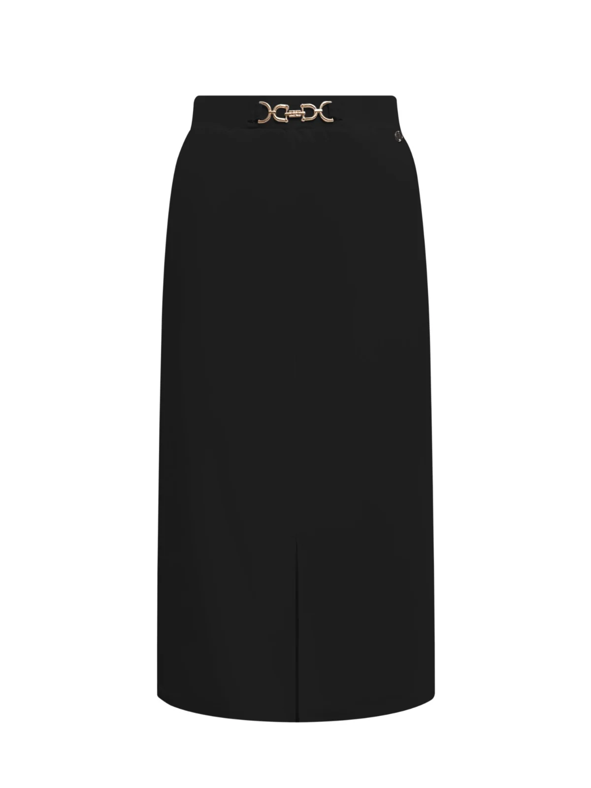 Vernieuwde versie van deze bestseller rok, door het gouden gespje aan de voorkant.  De rok heeft steekzakken en een brede band aan de bovenkant. De rok heeft een split aan de voorkant. Bij twijfel over de maat, adviseren we een maat groter. Lengte in cm: