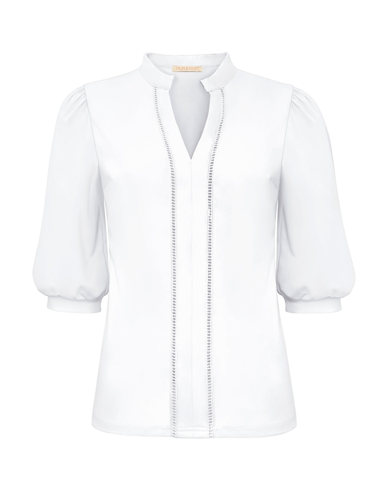 De top is van travelkwaliteit met ronde kraag doorlopend in een v-hals. De ietwat getailleerde top heeft half lange pofmouwen tot vlak boven de ellebogen. Dit item van top kwaliteit travelstof is een uitstekende match op de travelbroeken en travelrokken van Triple Nine. De blouse valt goed op maat S = 36. Borstomvang in cm zonder dat de stof opgerekt is: